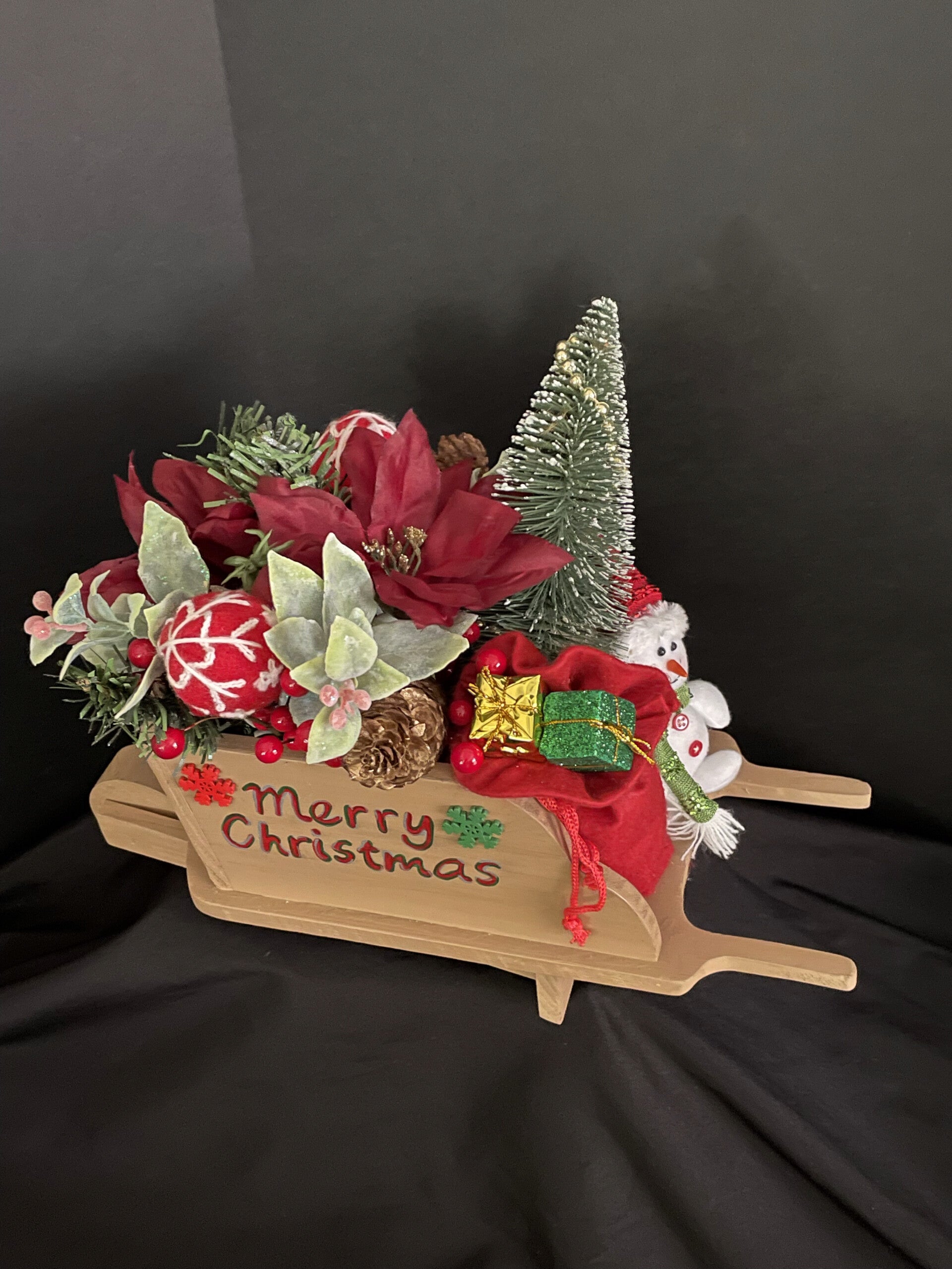 wheel barrel with snowman and other items for christmas related items