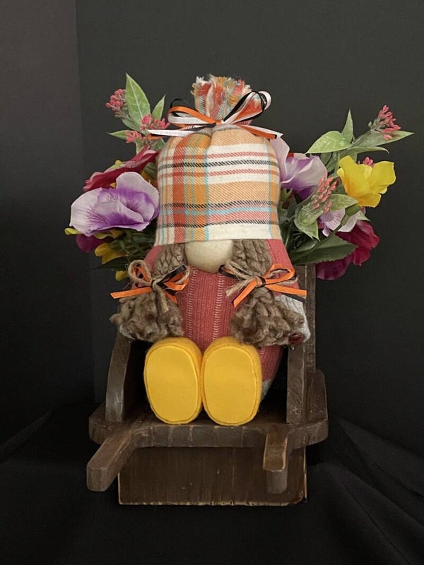 girl gnome for fall or spring in wheel barrel