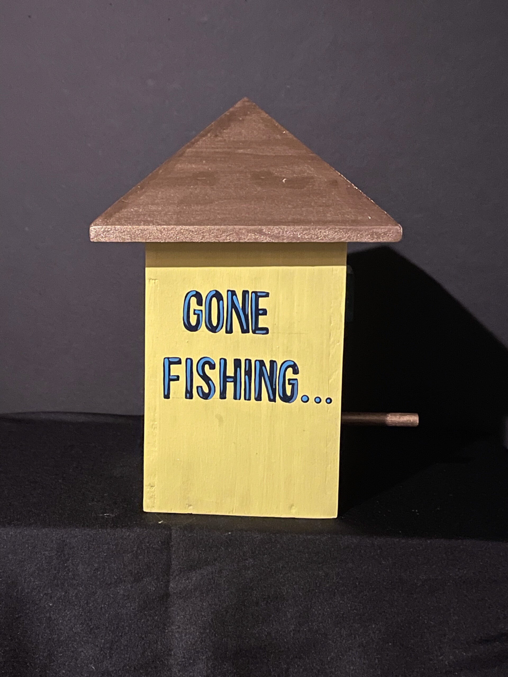 brown roof with yellow walls with gone fishing and trout on it