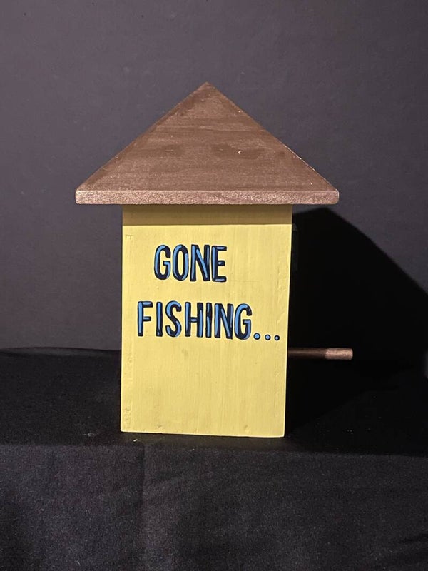 tall hip roof birdhouse with gone fishing and trout on sides