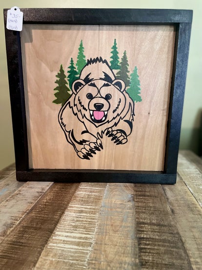 one bear with birds and three trees
